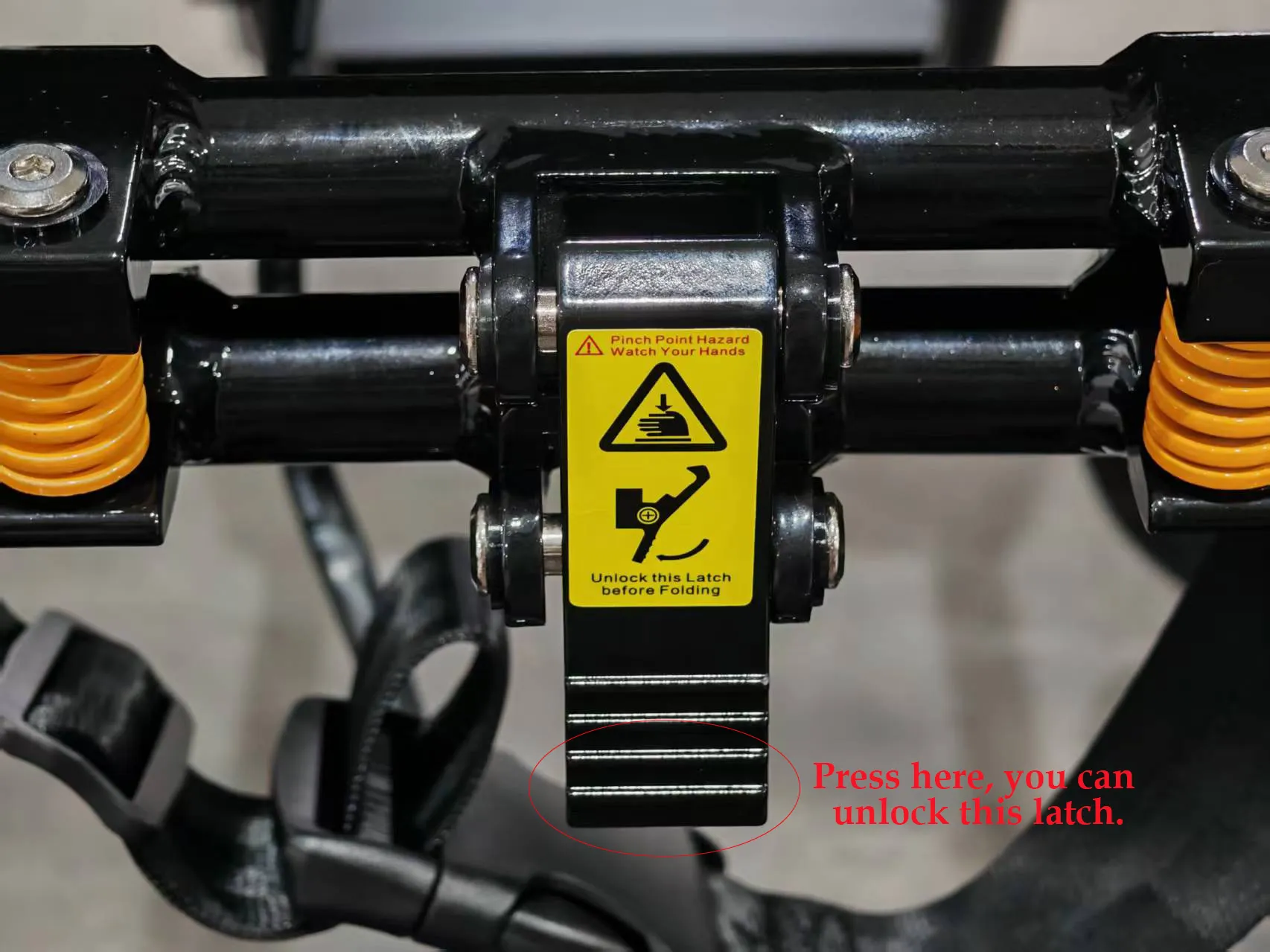 Our motorised wheelchair with this compact folding size can be put in the trunk of the car easily and you can go to your targeted destinations freely! Just press the bottom end of the latch in the picture, push the backrest forward and then the quick folding is done.